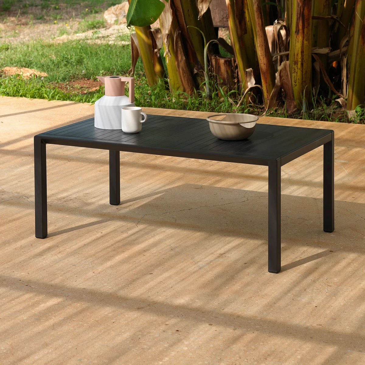 Table top and legs are made of epoxied aluminum, which makes them ideal for outdoor use. The material is resistant to any weather conditions. The table top is slatted so that any rainwater that accumulates can easily drain away and no annoying puddles form. Another practical feature is that the height of the feet can be adjusted. Thus, the table finds a firm, even stand even on uneven terraces.
