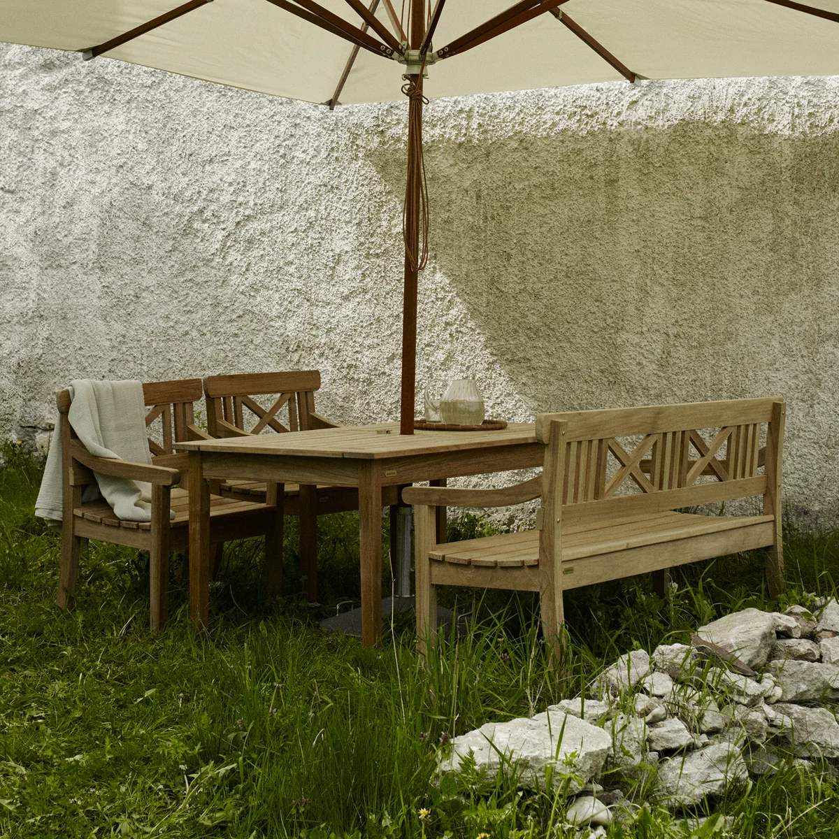 Teak is hard, stable and very easy to work with. At the same time, the wood is characterized by a unique content of naturally impregnating oils, which make the wood resistant to rot and fungal decay. Therefore, furniture made of high quality teak can stand outdoors all year round, without any further treatment other than regular cleaning. If you want to preserve the beautiful play of colors of the wood and want a darker shade, you can treat the furniture with oil. If desired, a seat cushion is also available for the Skagerak Drachmann Bench is also available a seat cushion.
