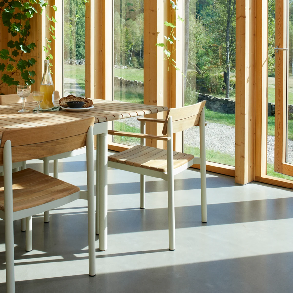 The Pelagus chair by Note Design Studio for the Danish manufacturer Skagerak impresses with its contemporary, graceful expression. The robust chair offers a high level of comfort for long dinners at the table. Its teak backrest and seat and powder-coated aluminum frame can be used in a variety of ways. It is light enough to move around easily. In addition, the Pelagus chairs can be stacked on top of each other due to their slim design.