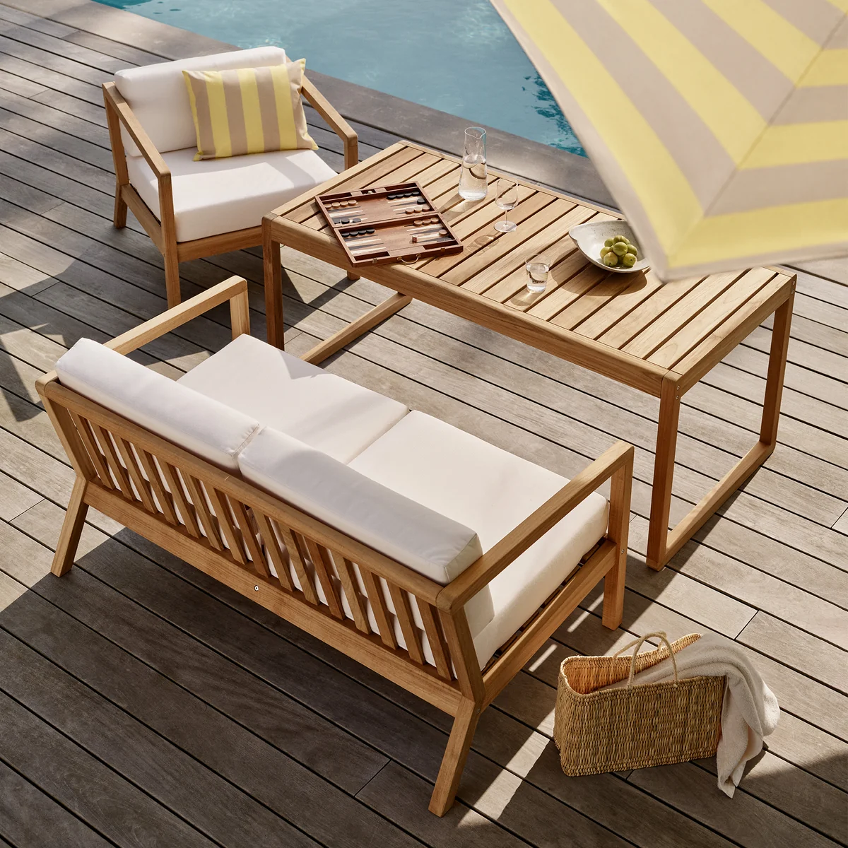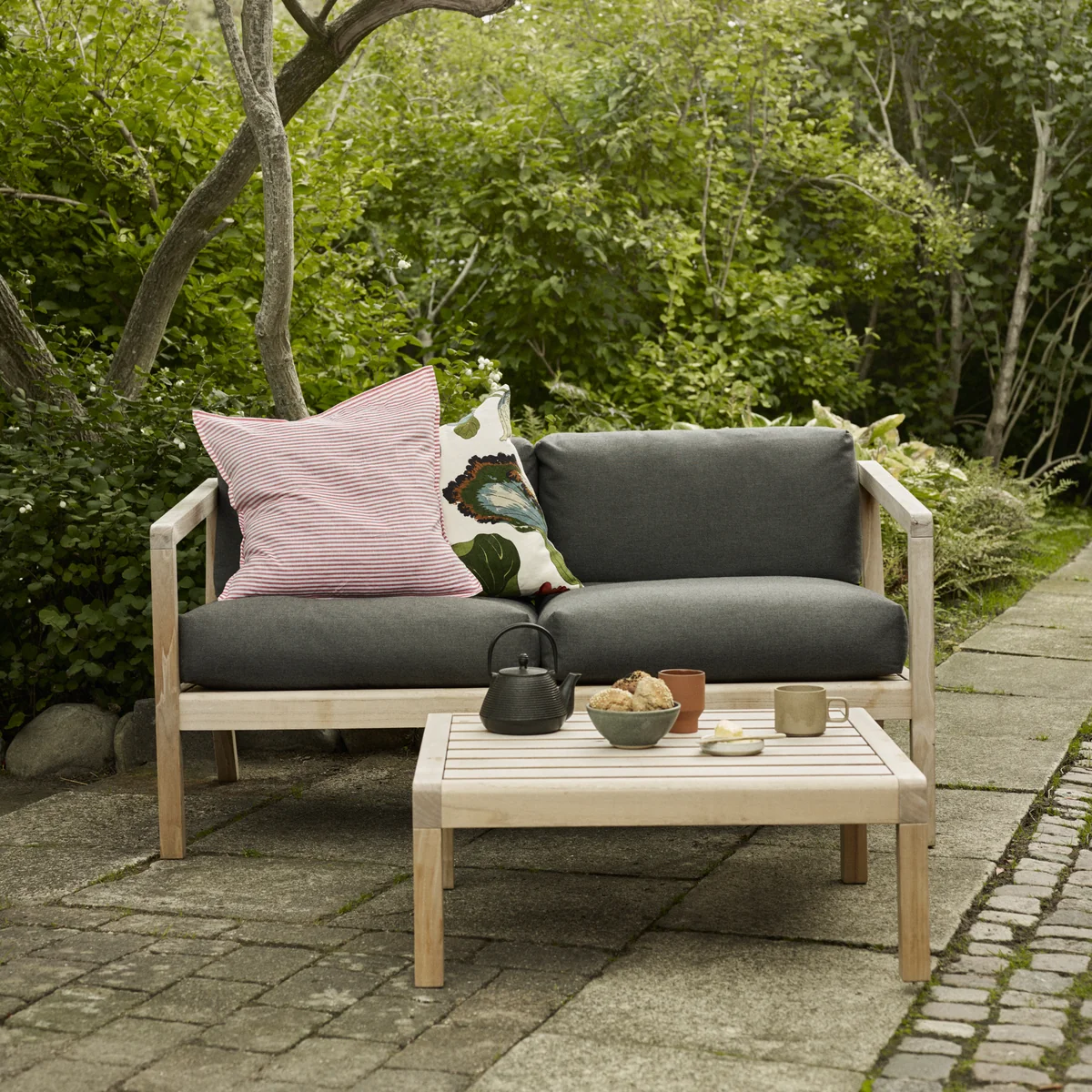 The teak wood of the frame comes from sustainable forestry. Complemented with the weatherproof barrier Panama cushions, the Virkelys sofa invites you to read and linger comfortably in the summer.