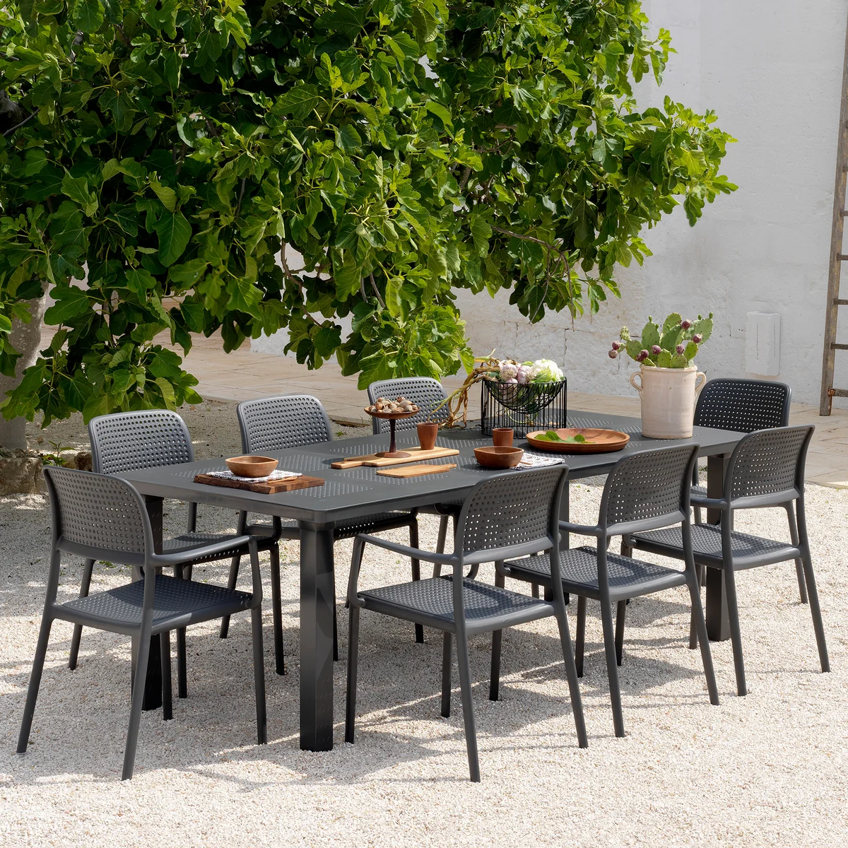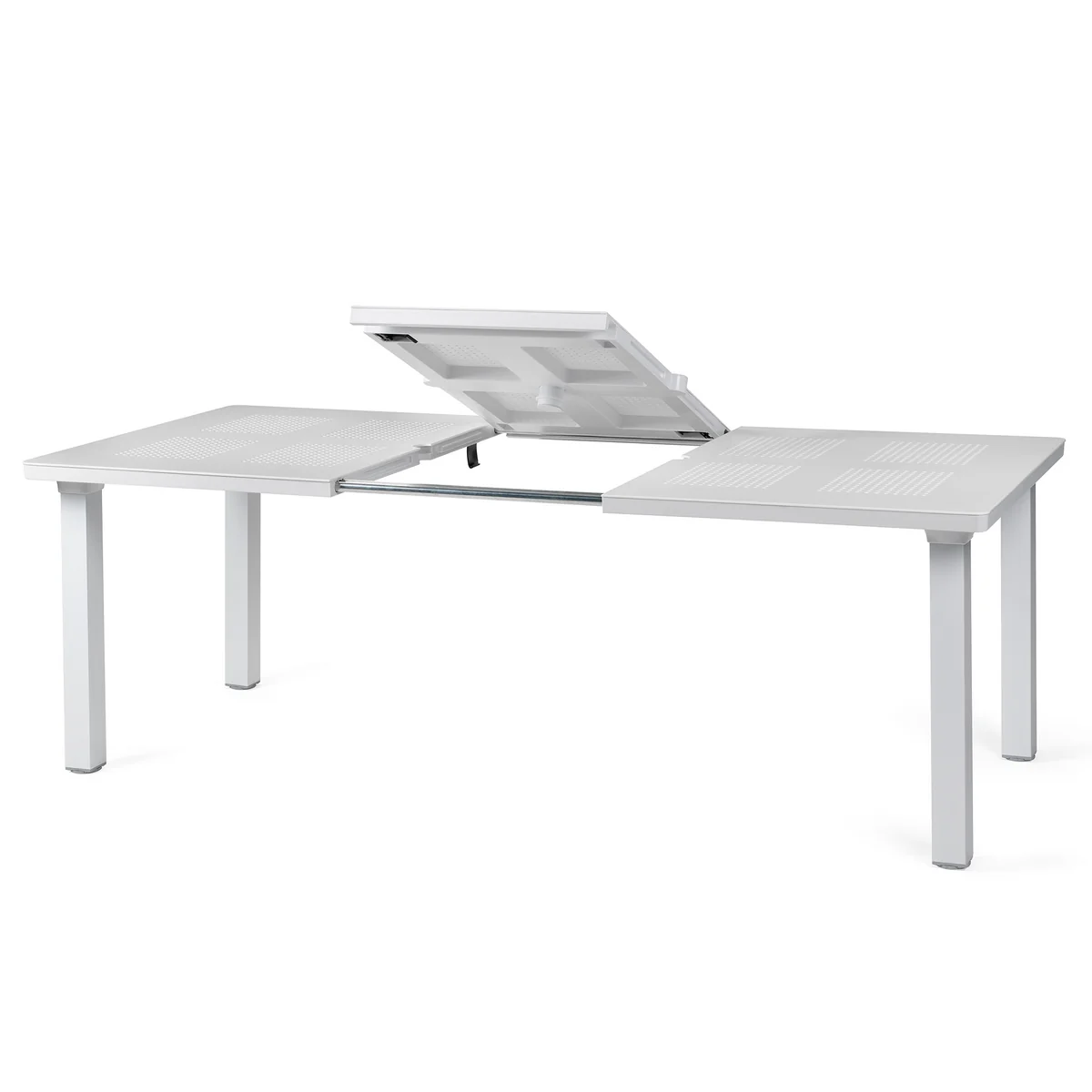 The Levante extendable table from Nardi is a polypropylene table designed for outdoor use, with a design reminiscent of traditional iron garden furnishings. The table surface is decorated with a pattern of small holes that repeat in sequence and can be extended from 160 cm to 220 cm. The square section legs are anchored to the surface with a simple screw system.