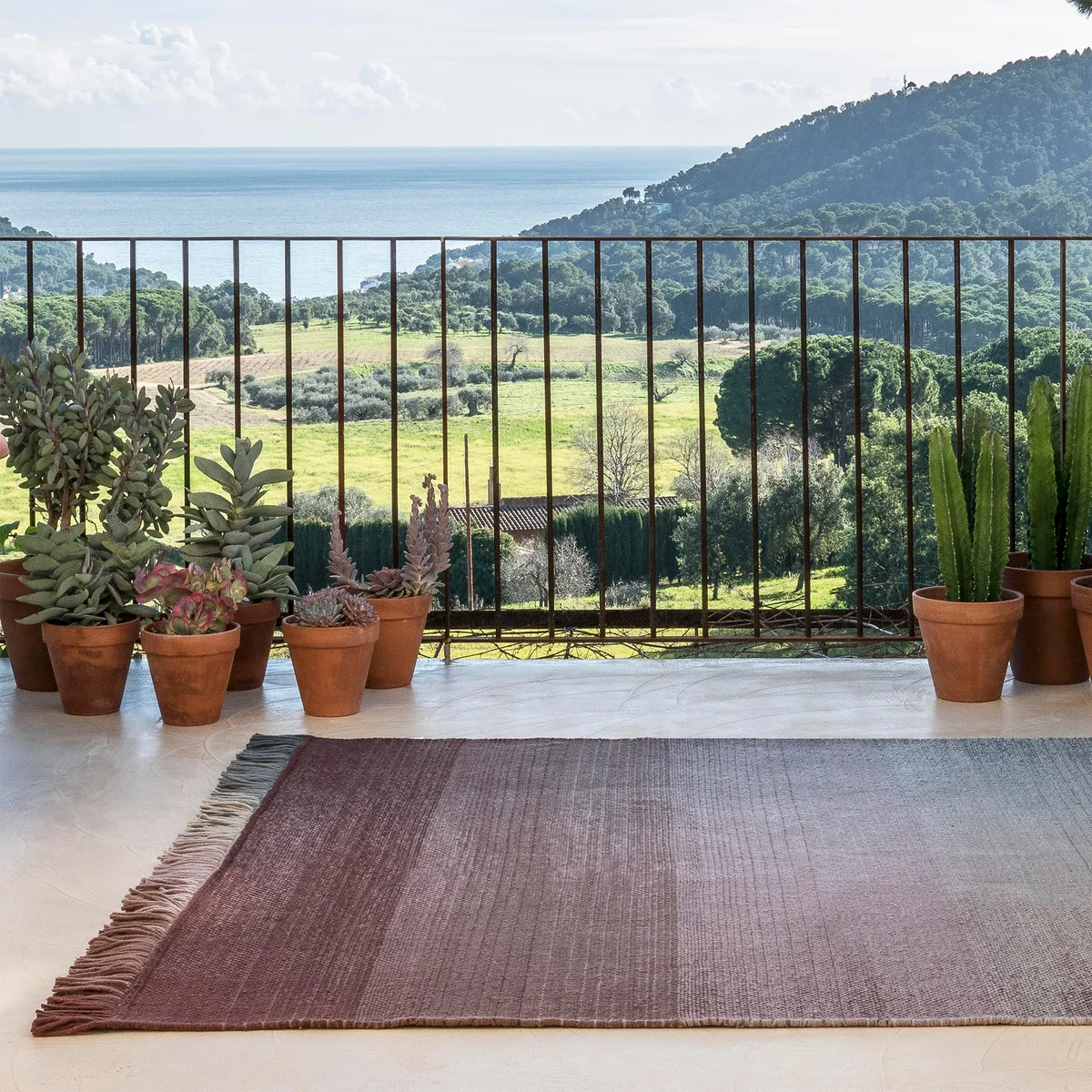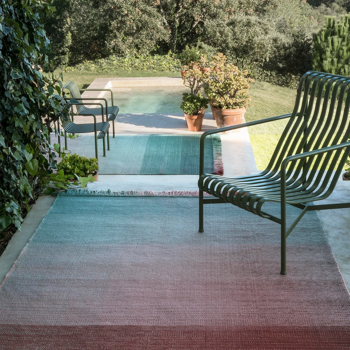 The Shade outdoor rug from nanimarquina impresses with its sophisticated color gradient, which is created using a complex process. The rug for indoor and outdoor use was created by Turkish designer Begüm Cana Özgür. In each rug, two gradient colors, one vertical and one horizontal, converge on the same plane, using six transitional shades. Just as the colors in the sky flow into each other, the carpet also creates a Shade carpet creates a complex and sensitive color gradient that is an eye-catcher on the terrace or balcony.