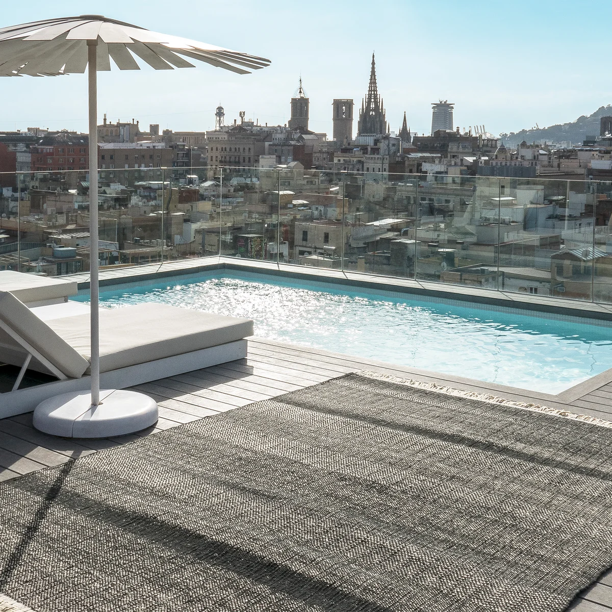 The rug is suitable for indoor and outdoor use, is made from recycled PET and is available in different variants and sizes. This makes the rug not only robust and weatherproof, but also environmentally friendly and sustainably produced. The material is produced through the process of recovering and reusing polyethylene (PET) waste, from which a lightweight fiber is obtained. The environmental benefits of this process are countless: it reduces the environmental impact, avoids the use of non-renewable natural resources and reduces energy consumption. Recycled PET has high abrasion resistance and good thermal properties, making it a perfect fiber for outdoor carpets.