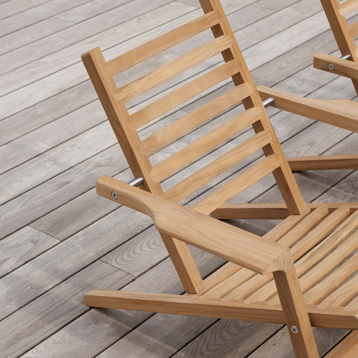 The AH603 outdoor deck chair designed by Alfred Homann for the Danish manufacturer Carl Hansen impresses with its high quality. The chair offers an exceedingly high level of comfort and fits ideally into its surroundings with its simple look. The aesthetic deck chair with armrests is made of solid teak and polished by hand at Carl Hansen .