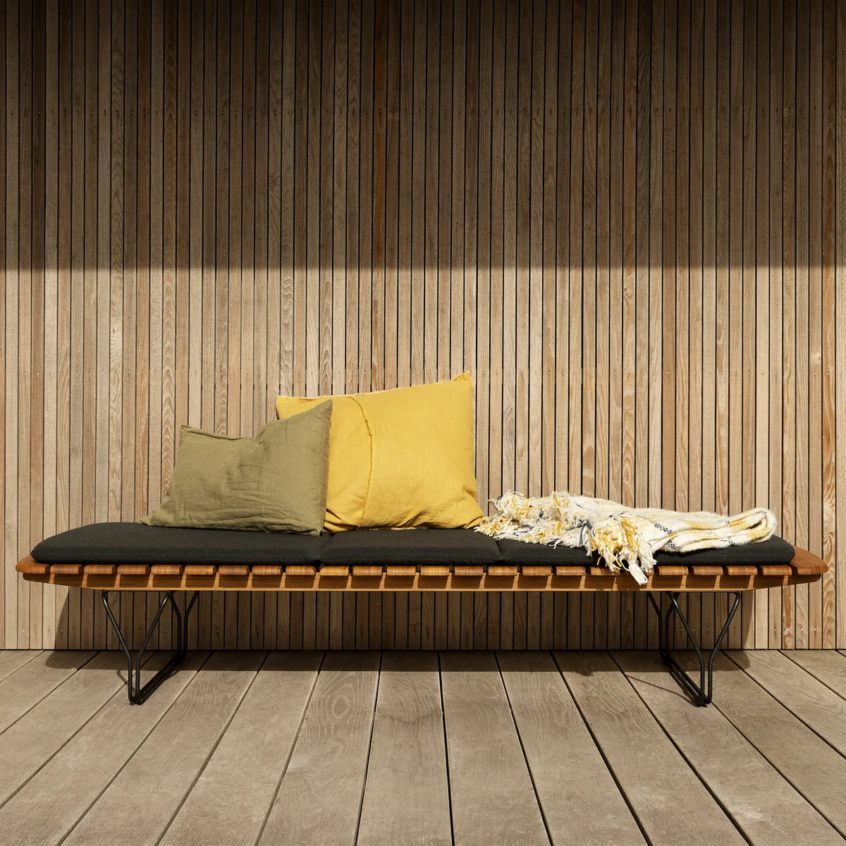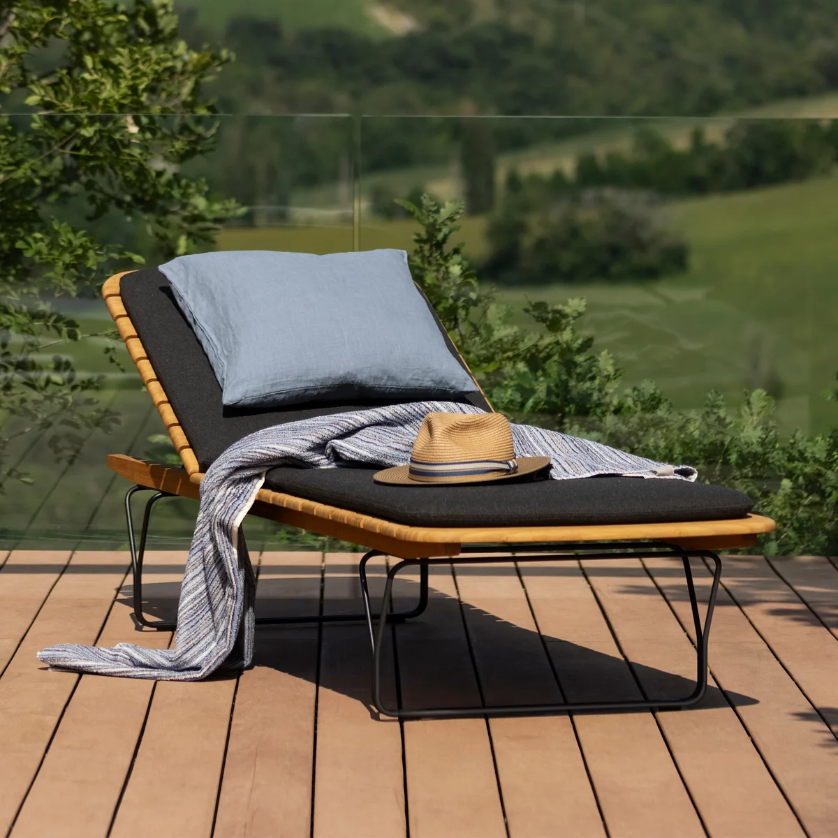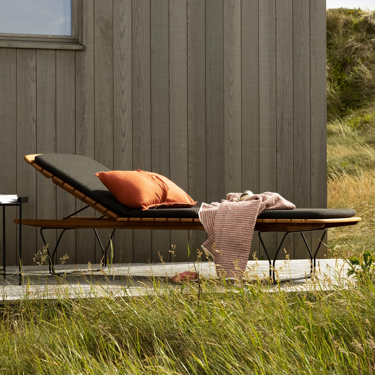 A characteristic feature is the reclining surface made of gently rounded bamboo slats, which conveys a warm, natural look and at the same time offers a high level of comfort thanks to its smooth surface. In combination with the sturdy powder-coated metal frame, it creates a harmonious interplay of lightness and robustness.