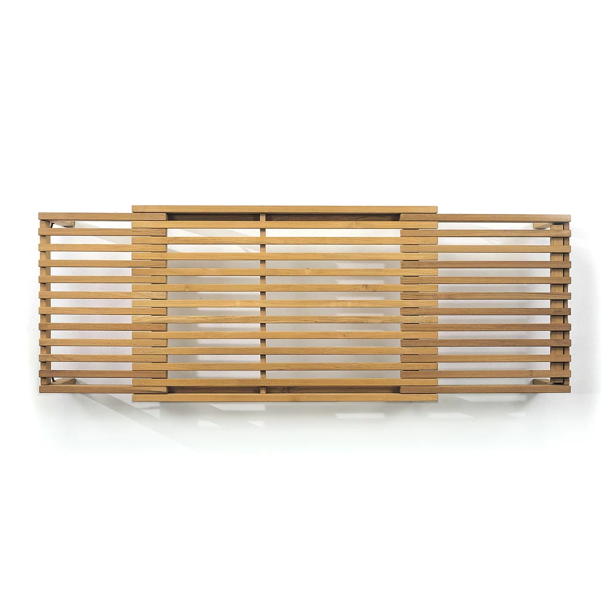 At the same time, the ingenious lattice principle makes the piece of furniture variable in length, so that it can serve as a comfortable lounger, a practical bench or a low table. As a contrast to the multifunctionality, the clear shape and the manufacturing from teak create a rustic and down-to-earth look, without any superfluous frills.