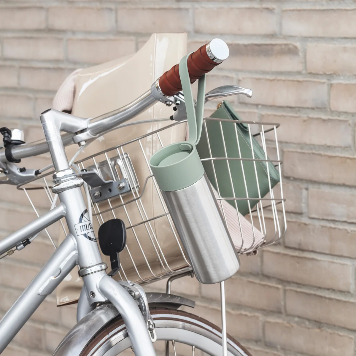 The shape of the thermal cup also ensures that it fits into most bottle holders on the bike and cup holders in the car. The strap on the thermo cup makes it easier to carry, allows it to be attached and provides an accent to the design.