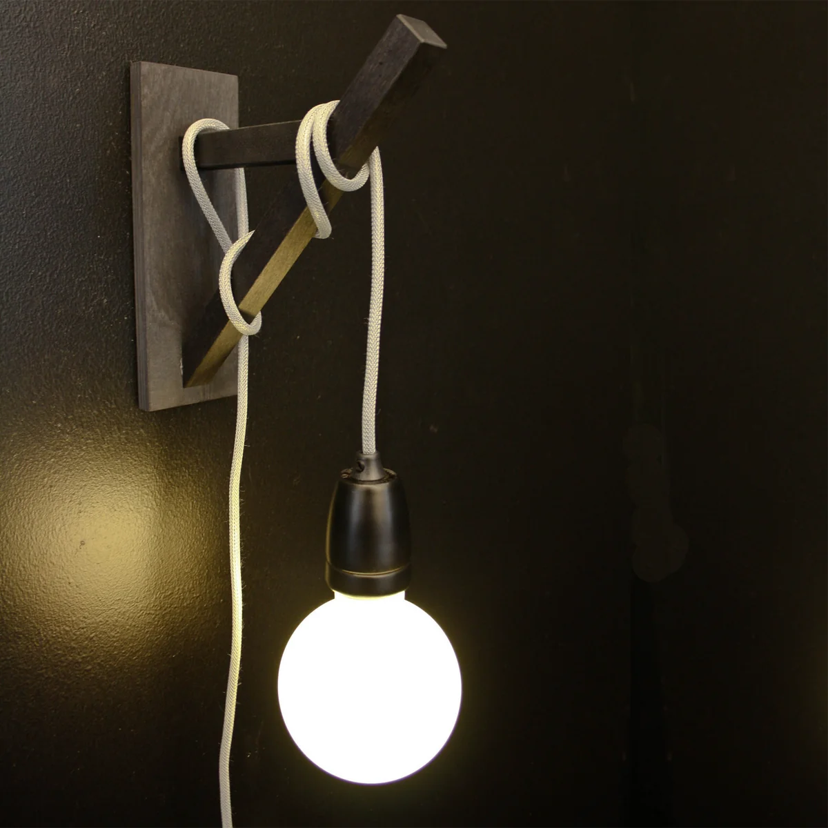The wooden bracket consists of a simple cross piece that is fixed on the wall. The textile coated cable is then wrapped around it, transforming the suspension light into a wall lamp.