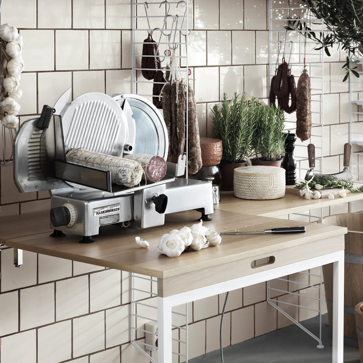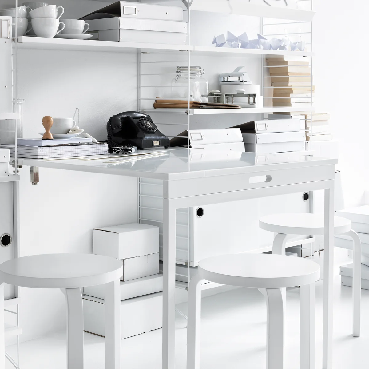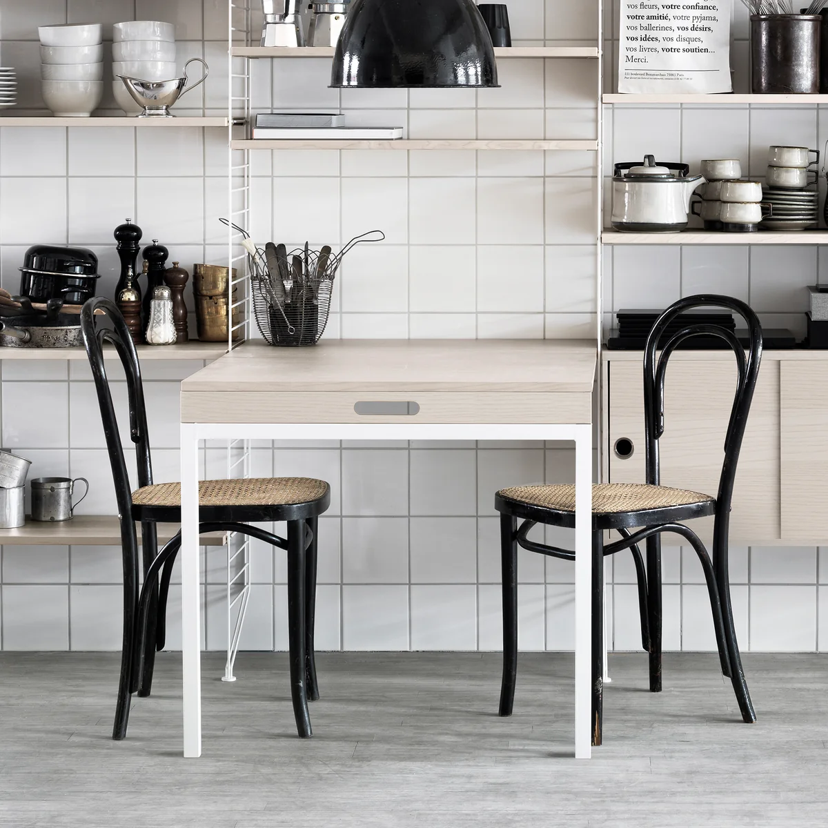 The folding table from String turns the shelving system into a folding dining table in no time, which looks great in the kitchen, living room or dining room and is ideal for smaller apartments and rooms where space is limited.