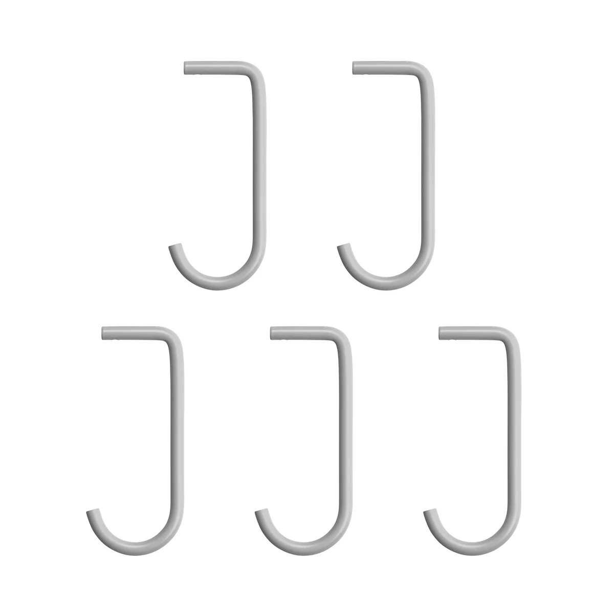 The hooks are simply hooked into the perforated metal of the shelves and can hold just about anything, from towels to pots and pans. They are made of metal, are available in different colors and come in a set of 5. Also available as practical S-hooks.
