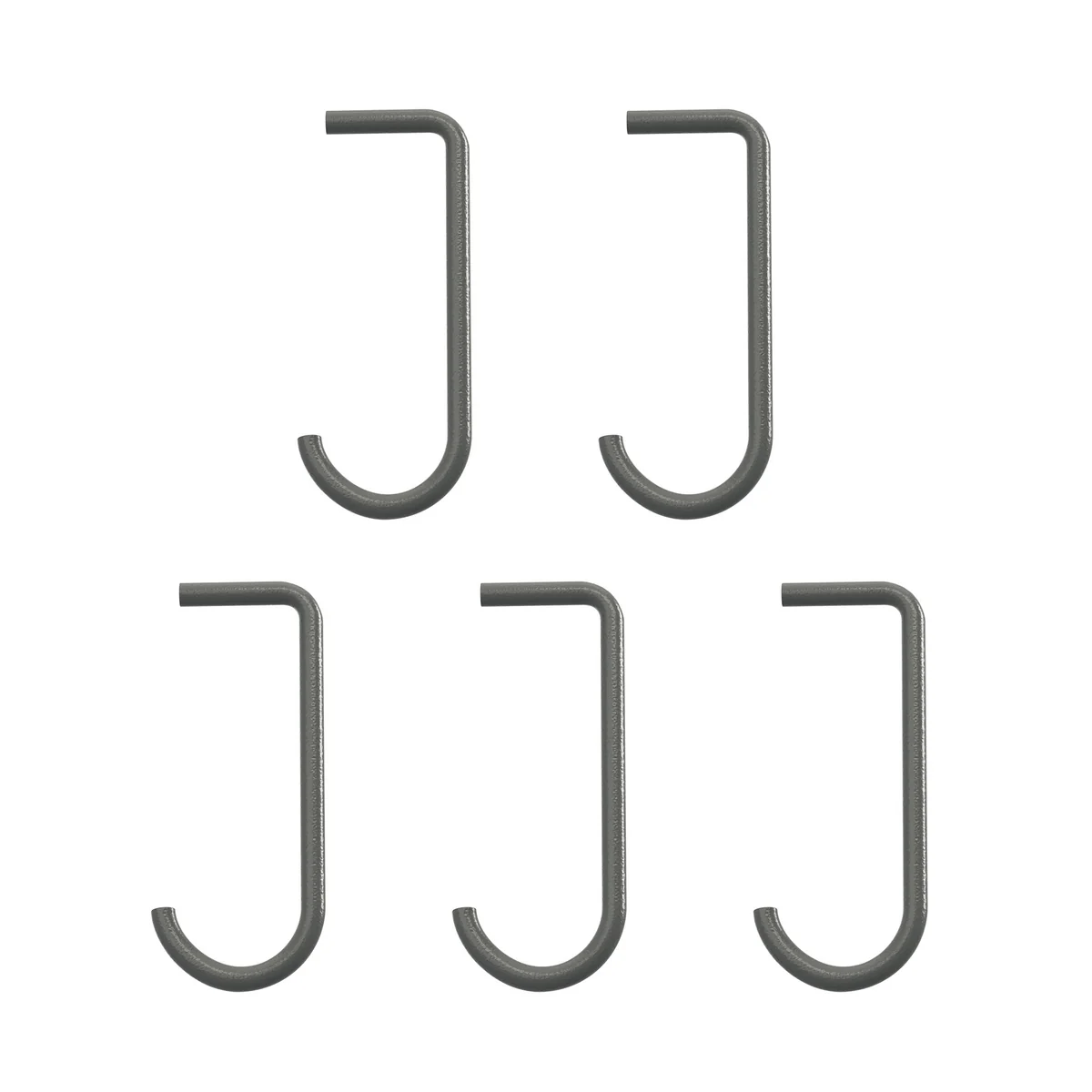 The hooks are simply hooked into the perforated metal of the shelves and can hold just about anything, from towels to pots and pans. They are made of metal, are available in different colors and come in a set of 5. Also available as practical S-hooks.