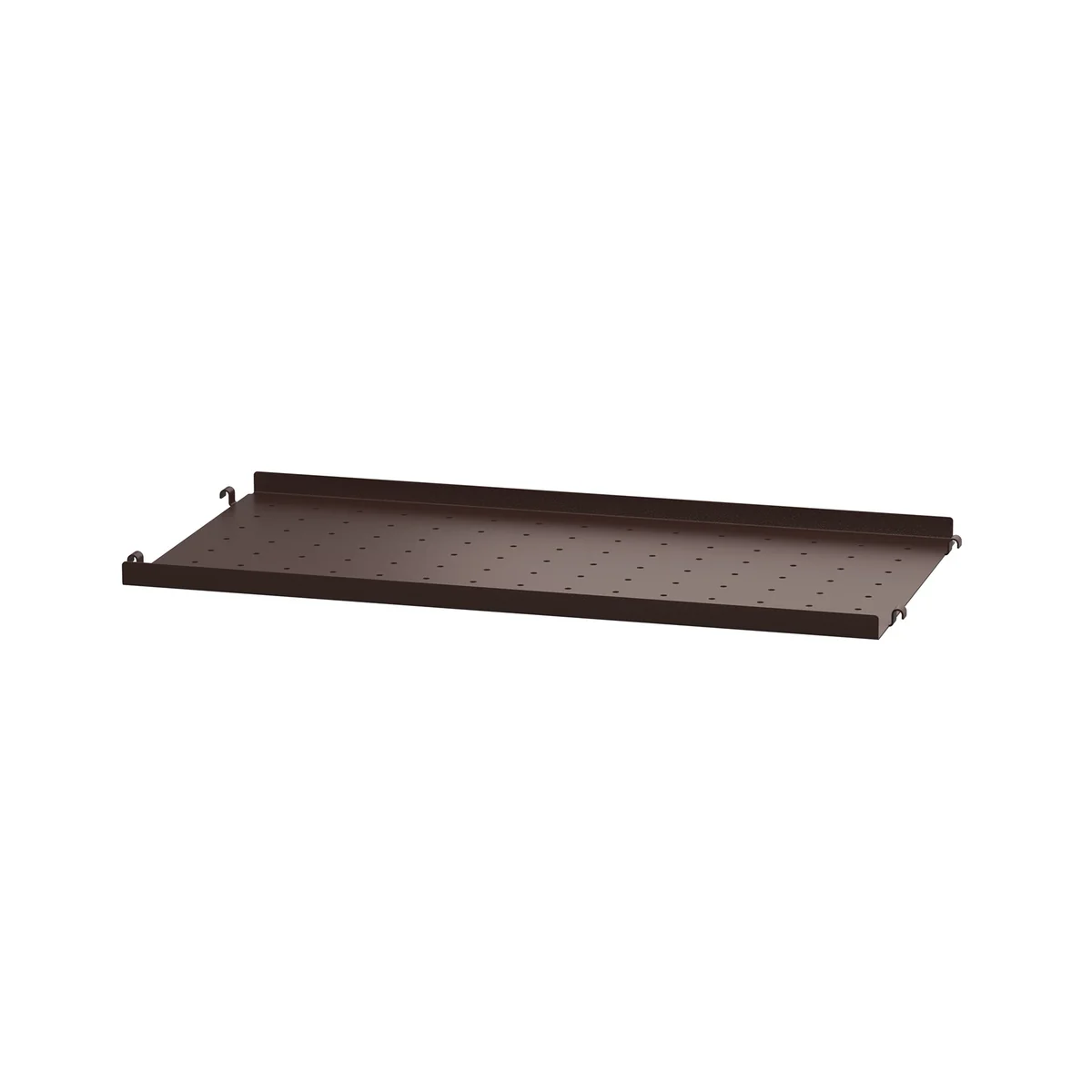 The metal shelves are particularly practical when the String shelving system is used as a wall coat rack in the hallway. Hats and scarves can be stored on the shelves, while hooks and rods can be hung on the underside thanks to the perforated base to hang jackets, umbrellas, bags, coats and coat hangers. A shoe rack made of perforated metal is also available to complete the wardrobe.