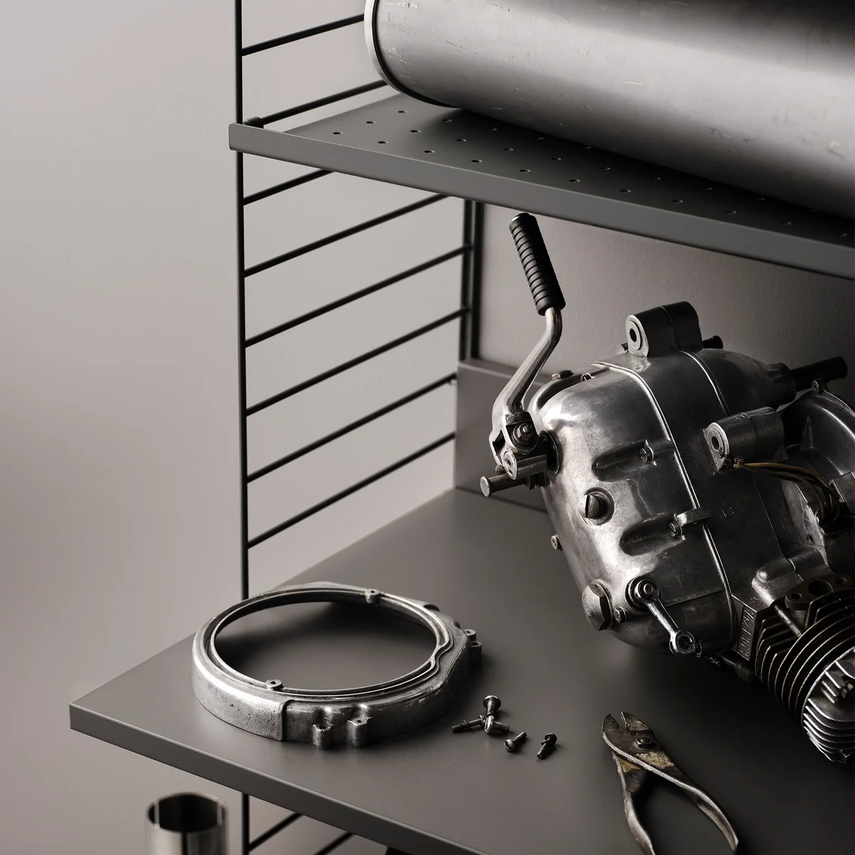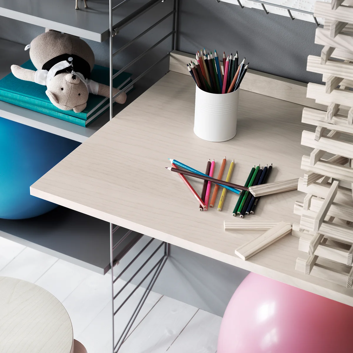 With the desk top from String the String shelving system becomes the perfect workstation. The top can simply be hooked into the wall and floor ladders with a depth of 30 cm and the shelving unit becomes a desk.