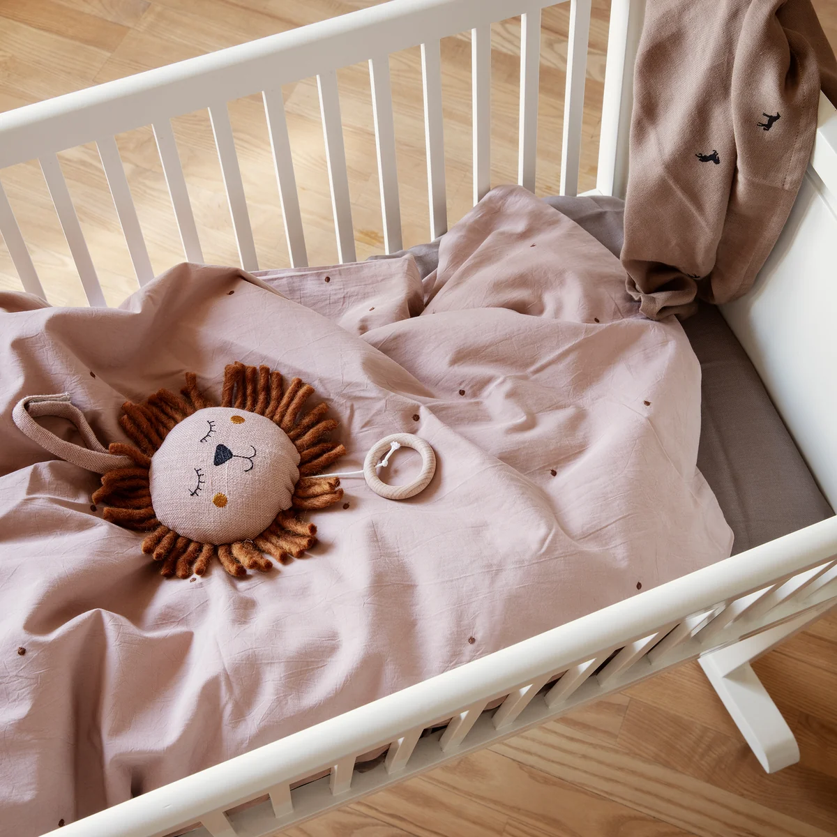 The cover of the lion is made of natural linen and the filling is made of recycled polyester. Available in various colours, the music box adapts perfectly to any children's room.